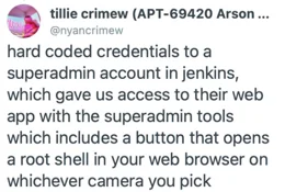 Een internationaal hackerscollectief, met de naam “APT 69420 Arson Cats” (what’s in a name..) heeft aan de hand van een hard-coded wachtwoord toegang verkregen tot maar liefst 150.000 beveiligingscamera’s. Zodoende kon er worden meegekeken bij onder andere ziekenhuizen, gevangenissen, politiebureaus, scholen en bedrijven. Waaronder dus ook Cloudfare en Tesla. Foute boel dus. De hackers zijn binnen weten te komen via een onbeveiligd intern Jenkins-ontwikkelsysteem van Verkada, het bedrijf dat de camera’s beheert. Dit systeem bevatte de inloggegevens van een account met zogenaamde ‘superadminrechten’. Meer dan dat heb je niet nodig. Doordat de groep naar eigen zeggen roottoegang tot de camera’s had was het daarvandaan ook mogelijk om toegang tot de netwerken van bepaalde Verkada-klanten te krijgen. Het collectief zegt verder informatie over duizenden Verkada-klanten te hebben gedownload, alsmede financiële cijfers van het bedrijf zelf.