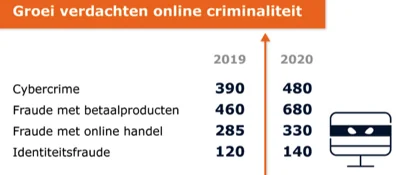 Het aantal geregistreerde gevallen van fraude met onlinehandel en identiteitsfraude kende een stijging van meer dan 30 procent in één jaar. De grootste stijging was echter zichtbaar bij het aantal verdachten van fraude met betaalproducten. Daar ging het aantal verdachten van 460 naar 680, een toename van 48 procent. Dat blijkt uit de eerste cijfers die het Openbaar Ministerie naar buiten brengt over 2020.